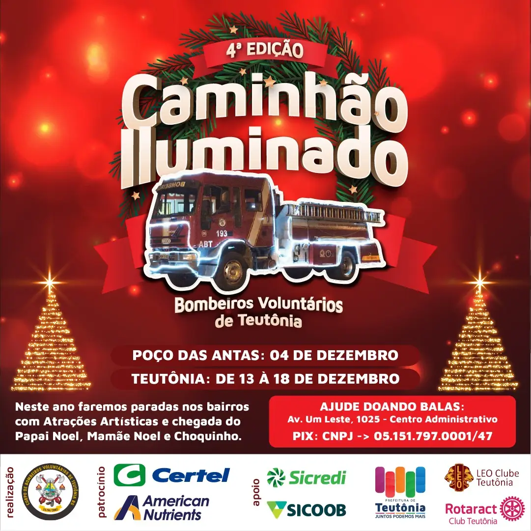 Em parceria com os Bombeiros Voluntários de Teutônia, a Certel participa da 4ª edição do Caminhão Iluminado. Trazendo alegria e diversão nas ruas da cidade, a cooperativa terá dois caminhões presentes no evento, juntamente com o mascote Xoquinho.