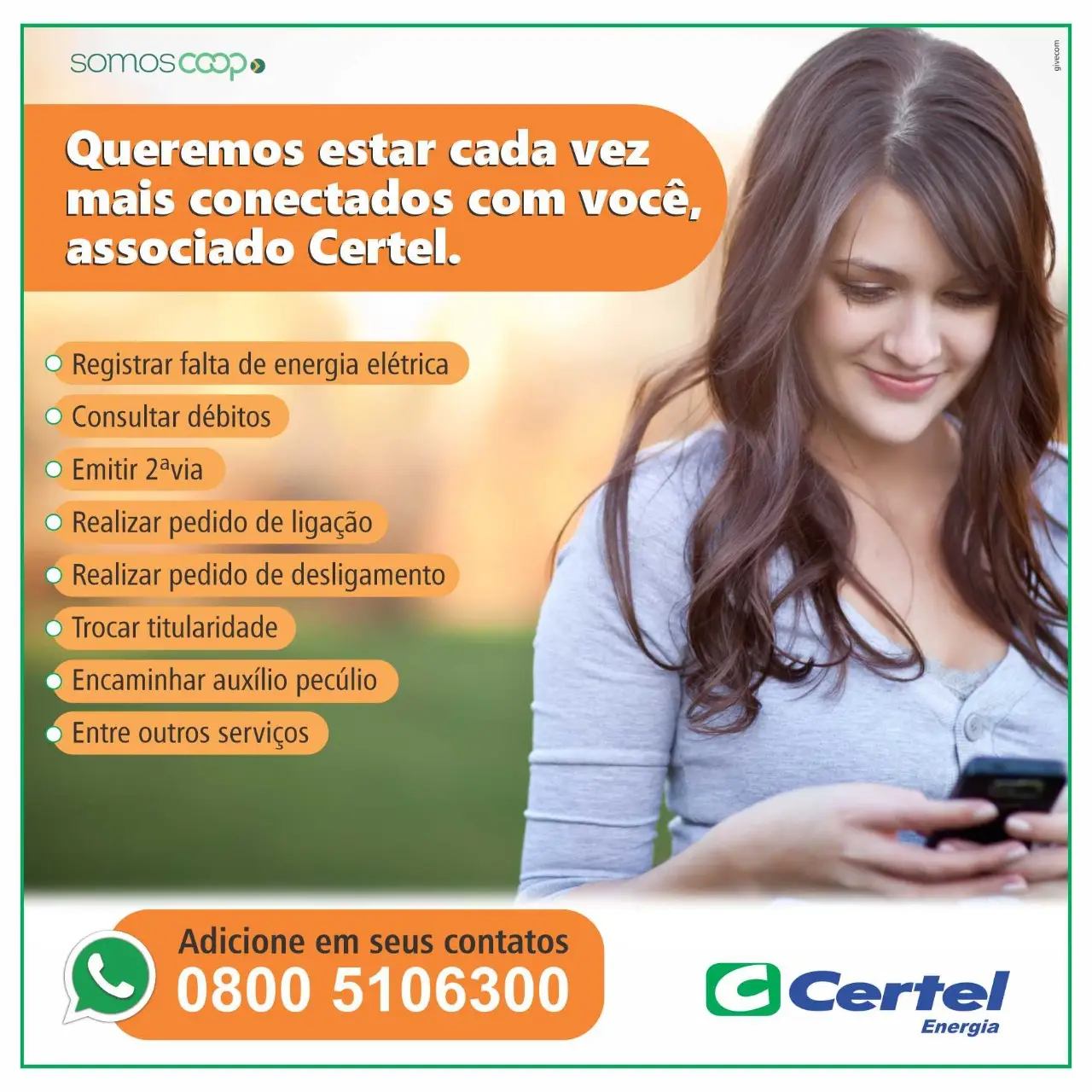 Logo, vale relembrar todas as formas de contato possibilitadas pela Certel. Além do WhatsApp – 0800 510 6300, que acaba de ser lançado, há também os telefones gratuitos 0800 510 6300 e 0800 520 6300; a Agência Virtual, no site www.certel.com.br; o Aplicativo Certel Energia, via smartphone; e os postos presenciais de atendimento, relacionados sempre na página 4 do Jornal Certel.