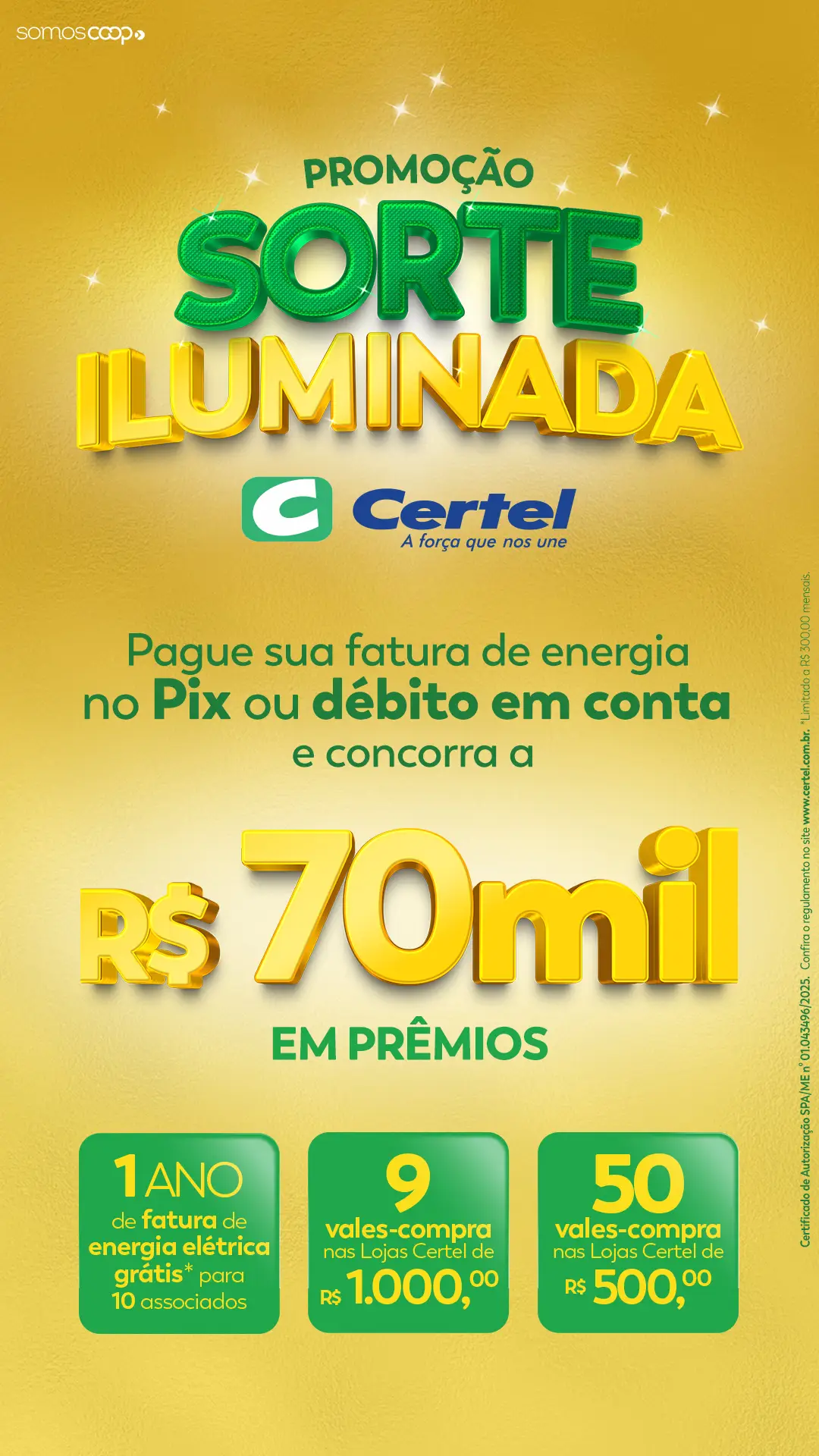 Vigora desde segunda-feira, 1º de setembro, a promoção Sorte Iluminada Certel, destinada a contemplar os associados consumidores da Cooperativa. Próxima do septuagésimo aniversário da Certel, que será comemorado em 19 de fevereiro do ano que vem, a promoção distribuirá R$ 70 mil em prêmios para incentivar o pagamento regular de faturas de energia elétrica via Pix ou débito em conta. Os sorteios serão nos dias 11 de outubro, 8 de novembro e 6 de dezembro. Associados que tiverem mais de uma conta de energia concorrerão através de cada uma delas.
