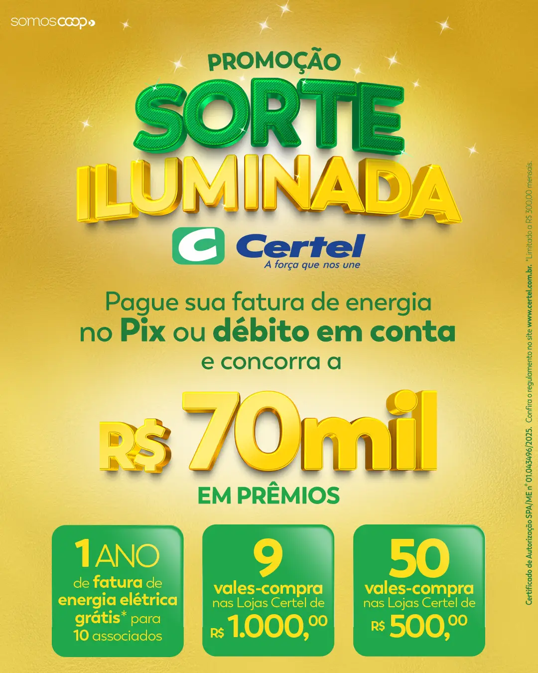 Ao todo, a promoção Sorte Iluminada Certel distribuirá R$ 70 mil em prêmios, com 50 vales-compra de R$ 500,00; nove vales-compra de R$ 1.000,00; e um ano de energia grátis (limitado a R$ 300,00 por mês) para 10 associados. Para participar, basta o associado efetuar o pagamento da sua fatura de energia pelo Pix ou débito em conta. O próximo sorteio será realizado no dia 6 de dezembro. Confira o regulamento no site www.certel.com.br.