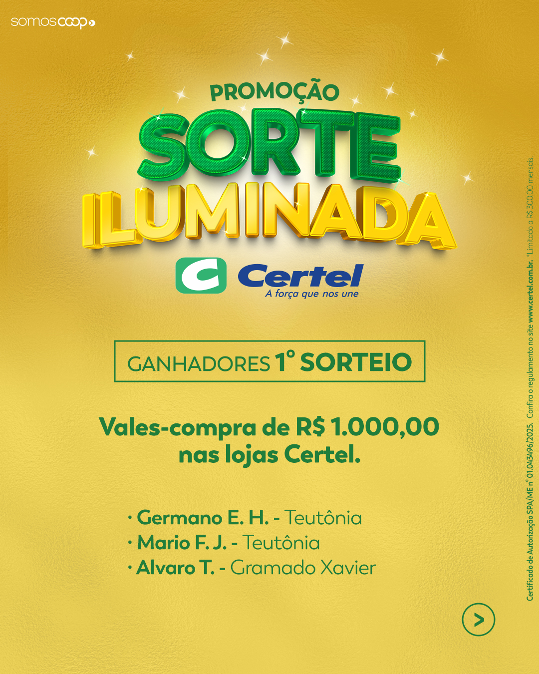 • 3 contemplados com um vale-compra de R$ 1.000,00 das Lojas Certel.